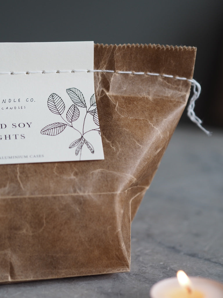 24 classic sized tealights are packed inside a waxed paper bag.