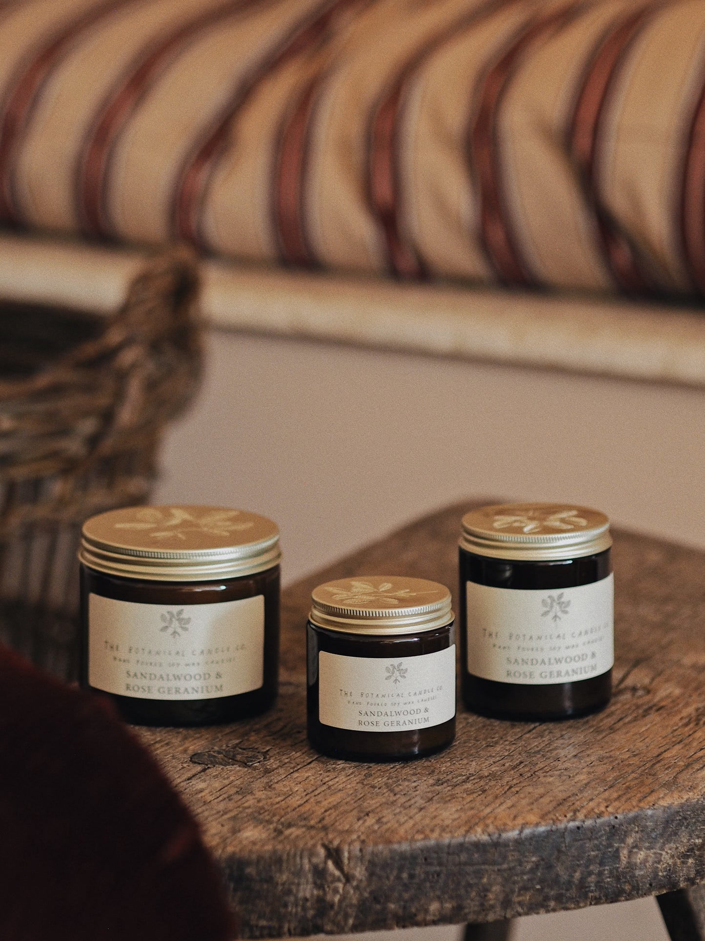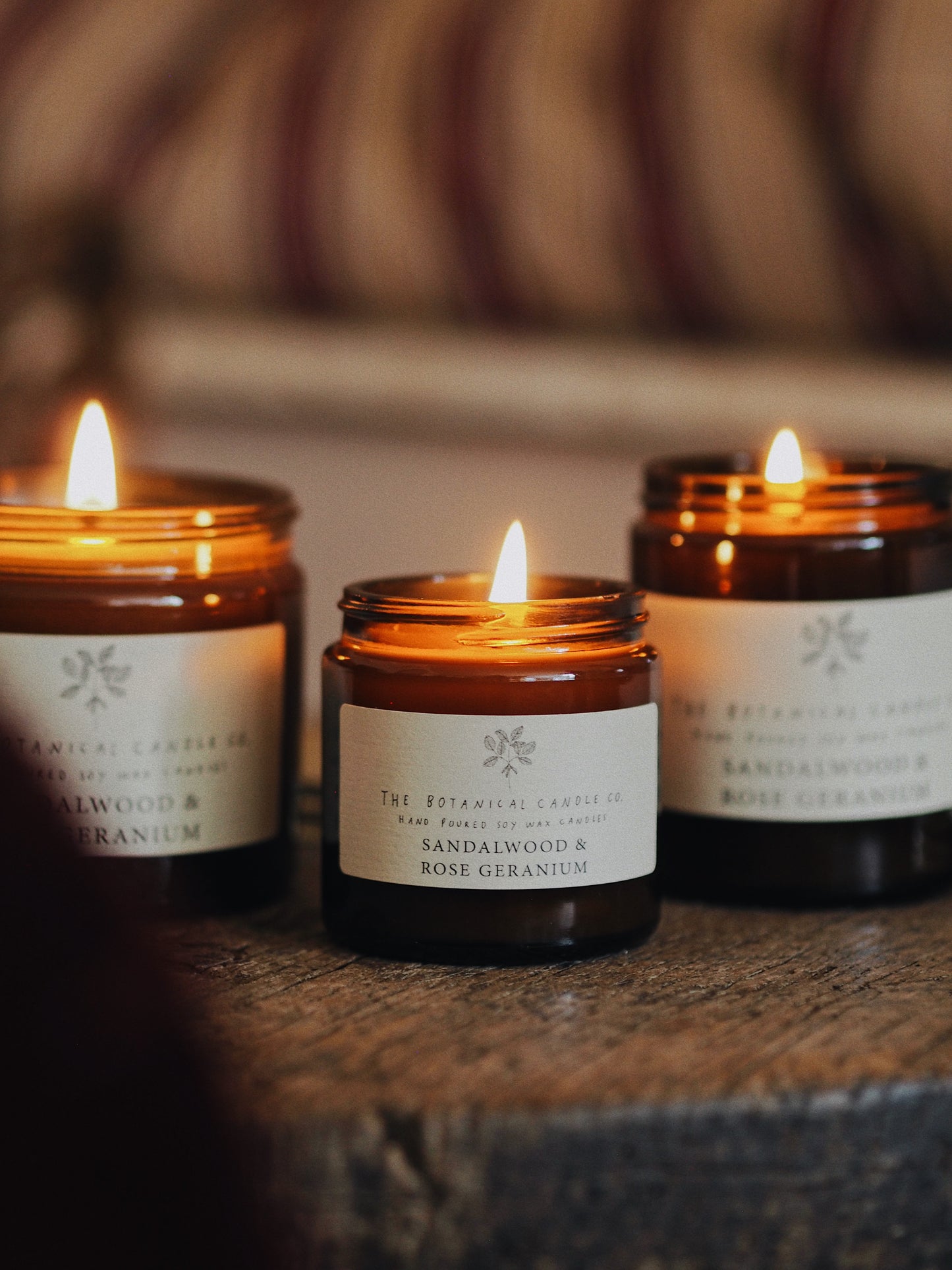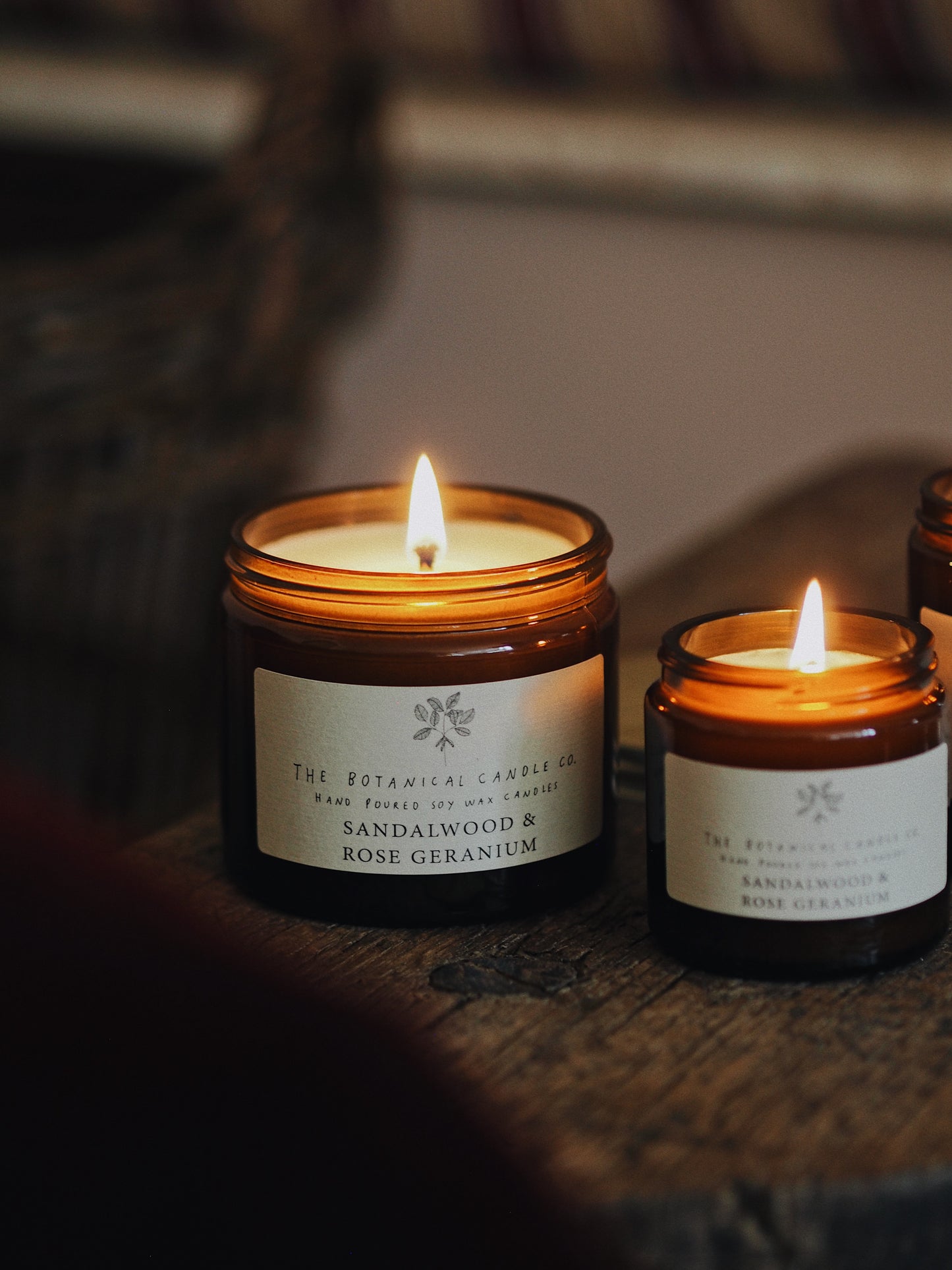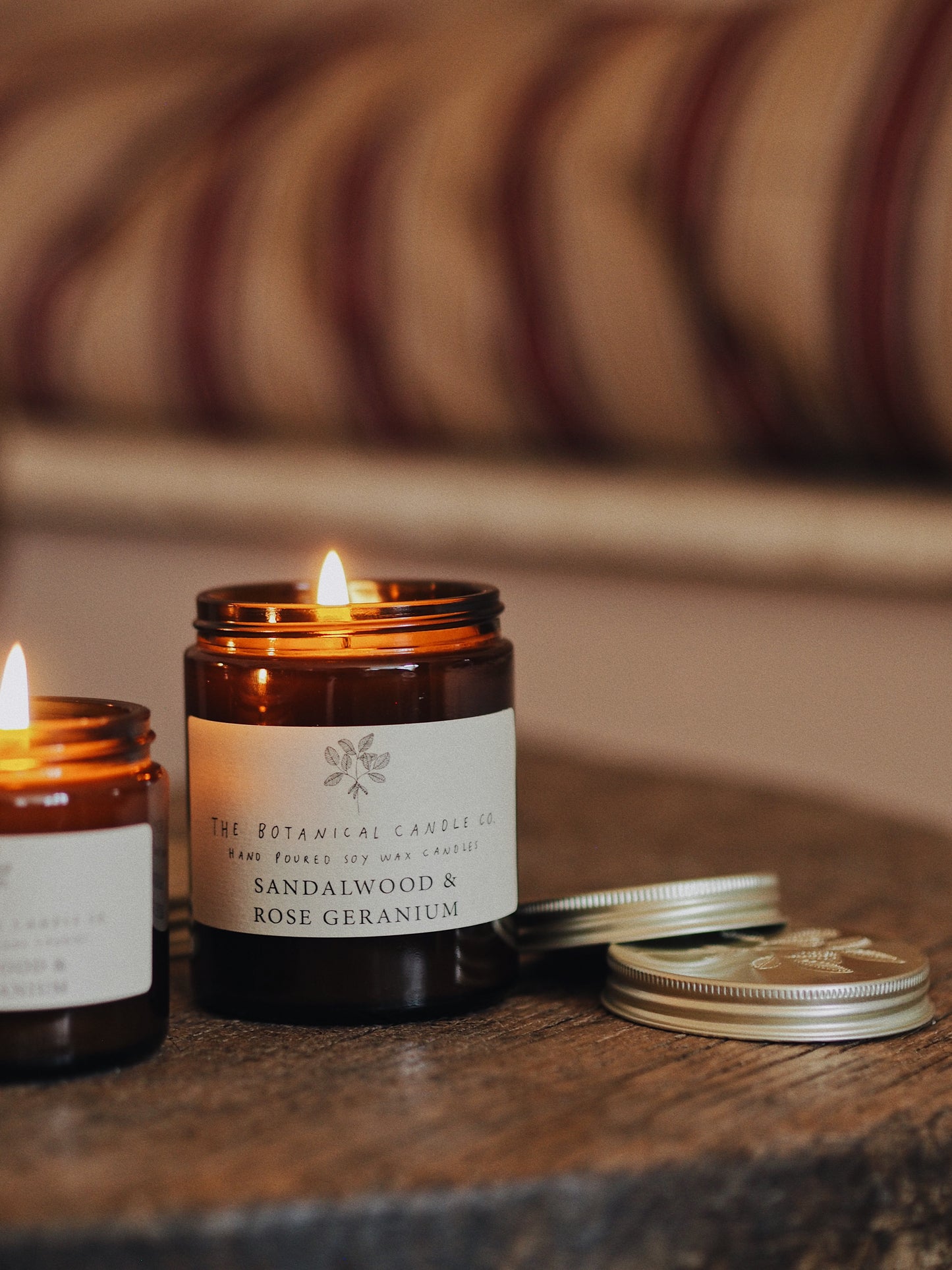 Sandalwood & Rose Geranium Soy Candle in Amber Jar