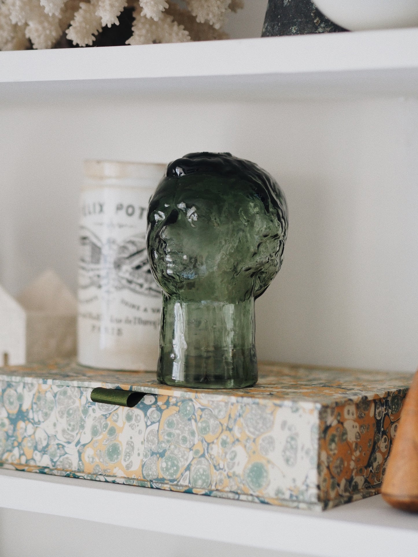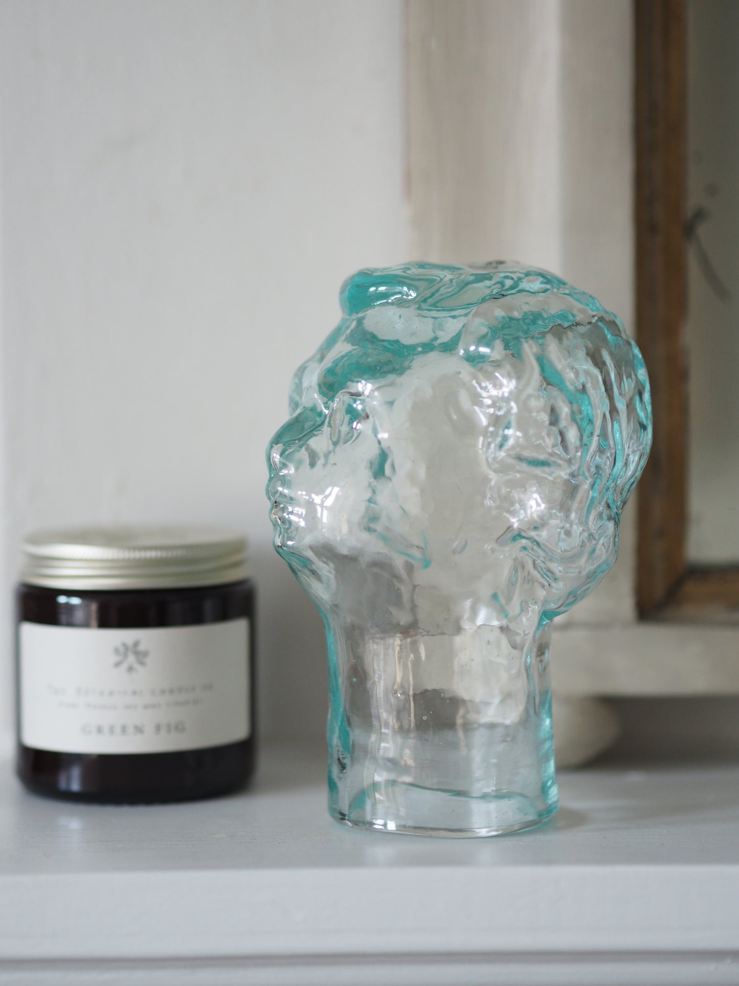 A fresh take on the classic range of head vessels La Soufflerie is renowned for, the inverted opening allows this to be used as a lid for a bottle or simply as a stunning piece of glass sculpture. As these are handmade, there is a pontil mark on the crown of the head. This is where the glass blowing pipe was broken off, so is a slightly rough small area. It is a sign of the fiery, elemental process it takes to make glass by hand.