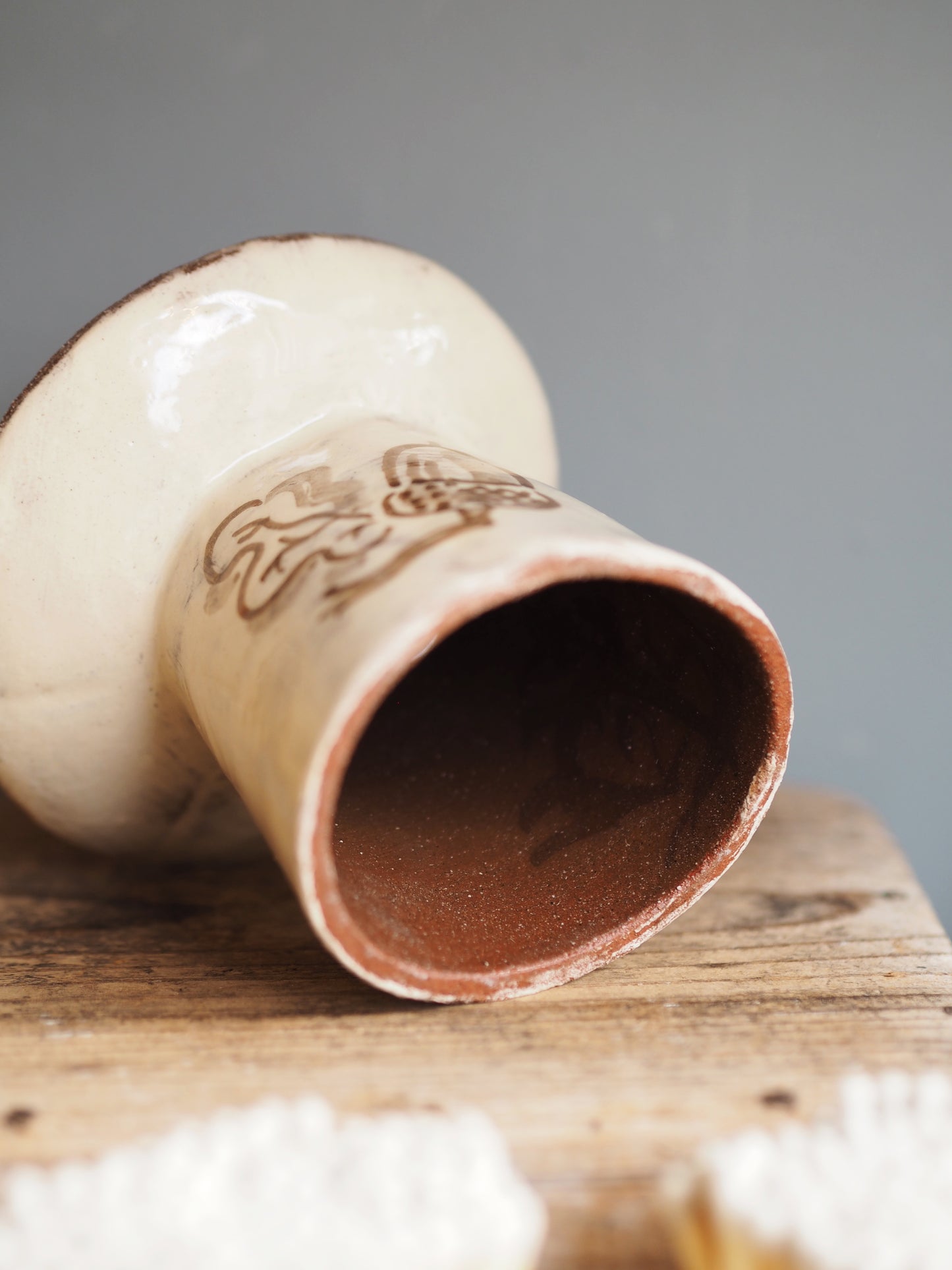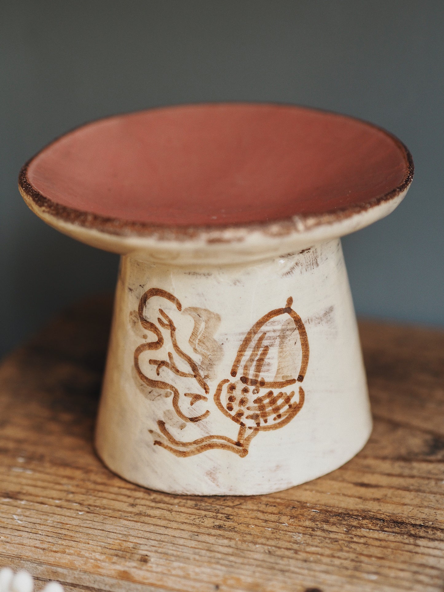 Each piece is fired once before being decorated with a chunky acorn and a pretty oak leaf, and is then fired again. Steven's work is slab-built from terracotta clay before he paints on his beautifully characterful designs in a soft, sepia-toned brown slip. The inside of the bowl is a blushing pink.