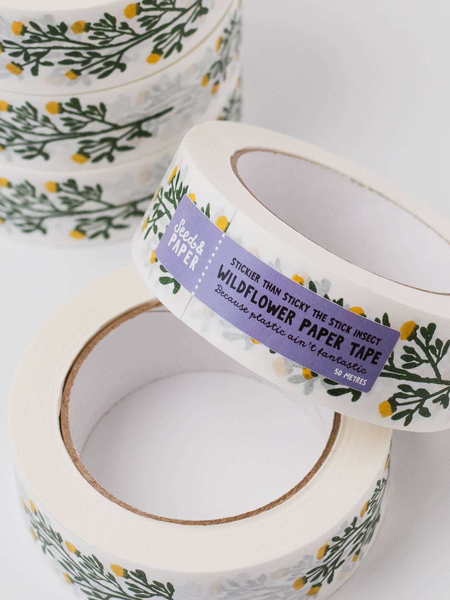This eco-friendly kraft paper tape features beautiful yellow botanical illustrations, adding a cheerful touch to gift wrapping, postal packaging, crafting or journalling.