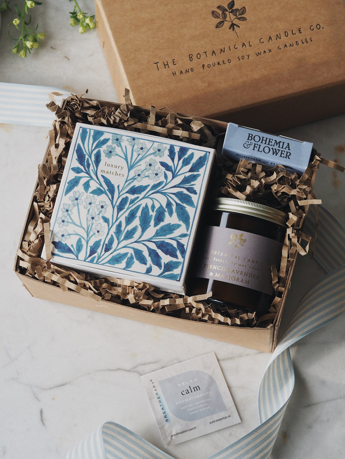 A Calm aromatherapy patch can be worn on the neckline, offering a few hours of subtle, relaxing scent. Everything comes in a handmade staple-stitch archive gift box from the UK, tied with a soft blue and white striped ribbon.