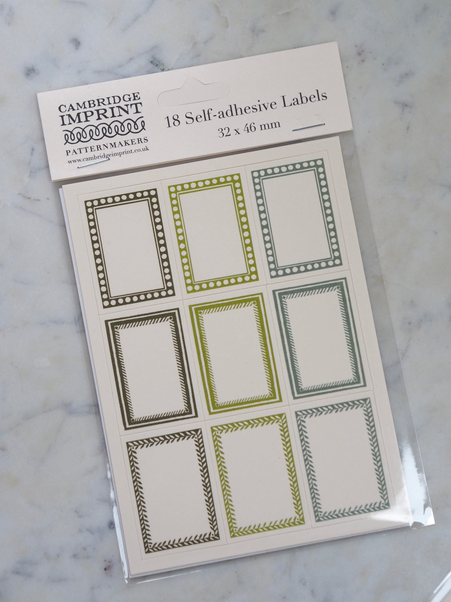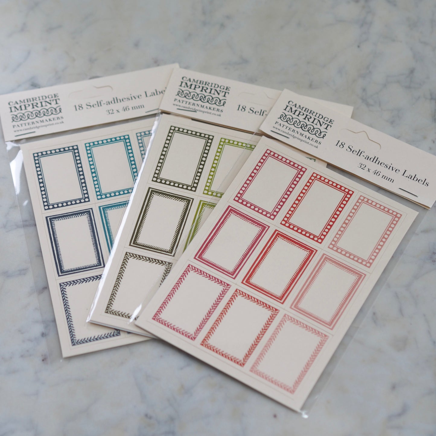 Robust matte ivory self-adhesive labels, measuring 46 x 32 mm, in 3 designs and 3 colours. There are two sheets of 9 labels in each packet, making 18 labels in all.