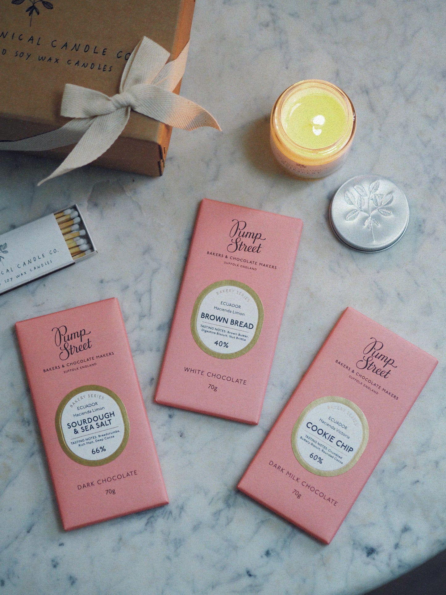A 120ml Soy Wax Candle in the scent of your choice 15 extra-long safety matches A 70g Pump Street Chocolate bar of your choice Brown Bread 40%. Contains milk powder and wheat. May contain eggs, nuts and sesame seeds. Sourdough & Sea Salt 66%. Contains: wheat. May contain eggs, nuts and sesame seeds. Cookie Chip 60%. Contains: wheat, eggs and milk powder. May contain eggs, nuts and sesame seeds. |